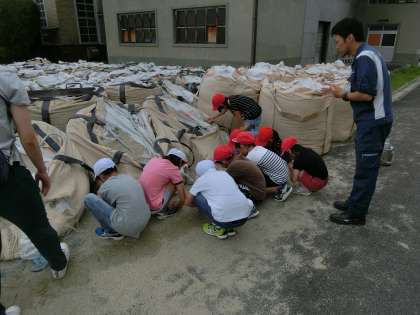 子ども達がしゃがみ込んで興味を示しているのは,0.5ミリの大きさに揃えられた砂粒です。最終段階で水をろ過するために購入されている特別な砂だそうです。