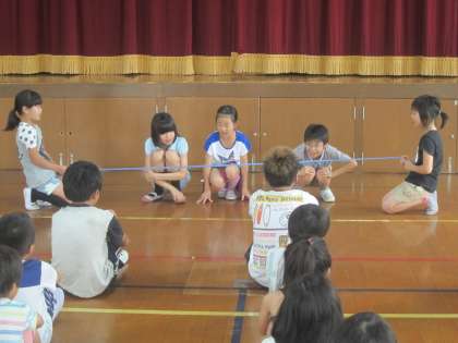 6月20日のなかよし集会で,健康委員会が,水泳学習の注意点について発表しました。それぞれの子どもたちが,1年生にも分かりやすいように説明しようと,いろいろと工夫をして小道具などを用意しました。
