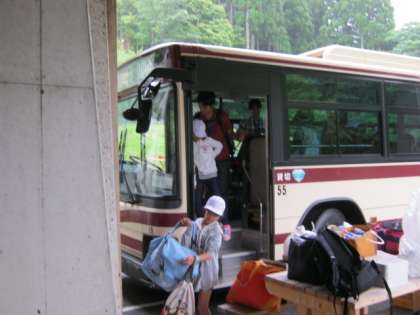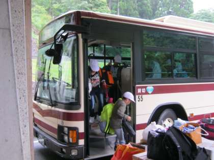 途中からは、霧の中を走っていました。標高約600メートルにある花脊山の家に到着です。外気温は20度くらいです。みんな元気に入所式に向かいます。