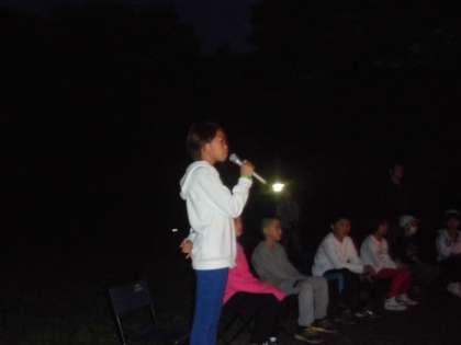 雨の心配がないため、予定通り屋外でのキャンプファイアーとなりました。進行は楽只小学校のレクリエーション係が担当し、名司会ぶりを発揮してくれました。進行はスムーズで、しかも楽しく、今日のテーマ「友情」にふさわしいキャンプファイアーとなりました。火の神から「挑戦の火」をもらった火の精役の子どもも、立派に言葉を言って点火することができました。ゲームにダンス、歌もあり、あっという間の1時間でした。