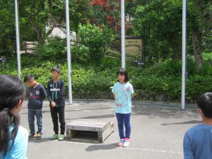退所式では、旗おろしや代表の言葉、所員さんや校長先生からお話を聞きました。花背山の家のマスコット、カエルのはなころに扮した所員さんが、ハイタッチでお見送りをして下さいました。