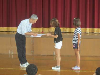 続いて,図工の絵画作品・立体作品の表彰がありました。友達の受賞を喜び,自然とわき起こる拍手が素晴らしかったです。賞状を受け取った子たちも,少し恥ずかしそうにしながらも,喜んでいました。