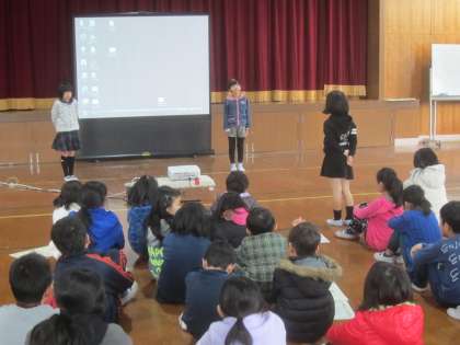 続いて,2年生からの発表がありました。紫野小学校の2年生と合同学習をしてきたことに関しての発表でした。生活・道徳・体育・学活など,一緒に学習した中で,学んだことや感じたことを上手に伝えることができていました。