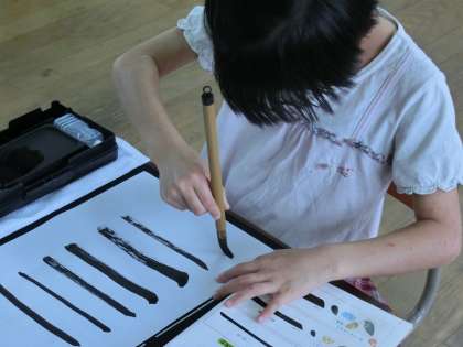 すずりの「海」で墨を付け,「陸」の部分で穂先を整えて,真っ白い半紙に,いろいろな太さの横線を書きました。