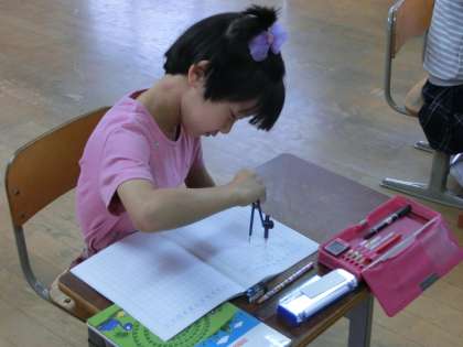 「きれいな まる」を描くために,コンパスを使います。初めての挑戦に初めは体をひねりながらの大苦戦をしていましたが,1時間目が終わるころには,ずいぶん上手になっていました。