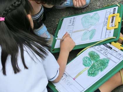 1年生が蒔いた朝顔の種が,かわいい芽を出しました。空に向かって両手を広げるように双葉をしっかりとのばしています。