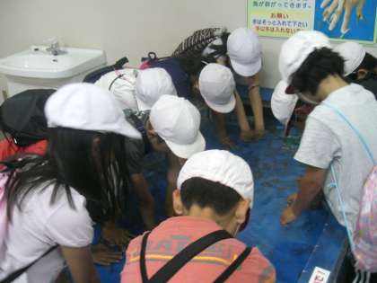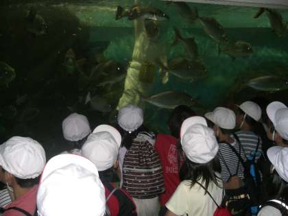 三日目の午前中は、水族館「志摩マリンランド」の見学です。フンボルトペンギンの「うーちゃん」の背中を触らせてもらいました。羽毛ですが、ふわふわした感じではなく、自分の油でしっかり体に付いていました。気持ちいいと言いながら触っている児童が多かったです。このほかにも、水族館のバックヤードに入れてもらって、餌やり体験もしました。館内のドクターフィッシュのコーナーでは、みんなが手を入れて、魚が自分の皮膚をつつく感じを楽しんでいました。また、回遊水槽では、海女の恰好をした水族館の人が魚に餌をやっている場面も見られました。