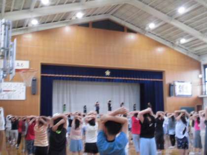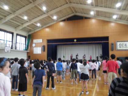 6月7日(水)の8:40から6月の児童集会を実施しました。運動委員会が水泳学習の前の準備体操を実際に舞台の上でするのを見ながら,全校児童も一緒に練習しました。今日は雨で水遊びはできませんが,明日,明後日は低学年の水遊びです。来週からは全学年の水泳学習が始まります。今日練習した準備体操をしっかりしてから水泳学習をしたいと思います。