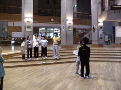 フリータイムの時間,レクリエーション係は明日のキャンプファイヤーに備えて打合せや練習に励んでいました。最後の夜を盛り上げるために頑張っていました。楽しみです。