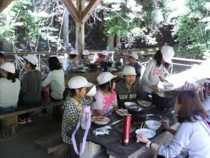続いて昼ごはんの野外炊事です。今回はすき焼き風にを作りました。おとといのトン汁,パックドッグと続いて3回目ともなるとみんな,手際が良くなってきました。どのグループもおいしいご飯とすき焼き風煮ができました。おなか一杯になりました。次は………。