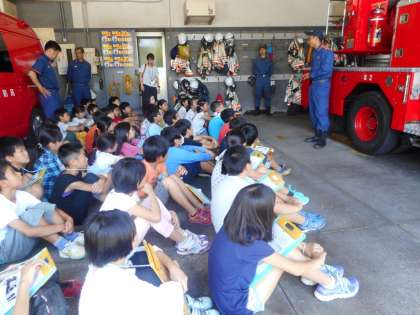 子どもたちは,よく知っている「はしご車」や「ポンプ車」以外にもたくさん種類があることに驚いていました。