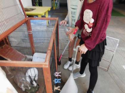 毎朝,飼育委員会の児童が,ウサギの世話をしています。掃除をしたり,えさを入れたり,水をかえたりみんな頑張って仕事をしています。ショコラとバニラはえさをしっかり食べて,元気に活動しています。