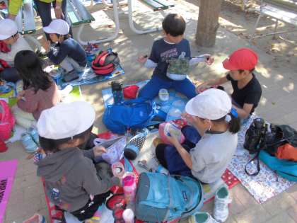お昼ごはんはなかよしペアで食べました。大きな声で「いただきまーす。」を言いました。おいしいお弁当ありがとうございました。午後は自由遊びをしました。もう一度気になる動物を見に行ったり、「どんじゃんけん」や「はじめのいっぽ」をしたり、思い思いの過ごし方をしていました。みんな楽しかったね。