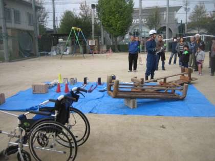 避難訓練の後,運動場を3つのブースに分けて,各訓練をローテーションで行っていきます。(AEDを用いた救急訓練・バケツリレーと元にした初期消火訓練・防災に係るいろいろな機材の意味や使い方を学ぶ防災機材取扱い訓練)