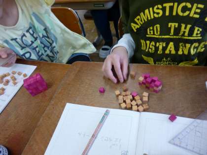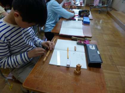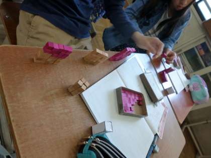 算数科で体積の学習が始まりました。今日は,2つの直方体の体積をくらべるために,1辺が1cmの立方体が何個分か調べました。その後,ペアで「30㎤の直方体を作ろう!」や「70㎤の直方体は作れるかな。」など,いろいろ話しながら,直方体を作る体験をしました。