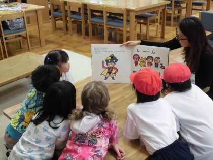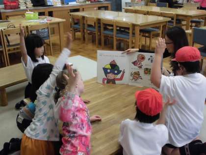 今日は,中間休みに,図書館ボランティアの“ぽぽんた”さんによる読み聞かせがありました。大型絵本を何冊か読んでいただいたのですが,低学年の子たちが身を乗り出しながら聞いている姿からも,お話を楽しんでいる様子がよく伝わりました。