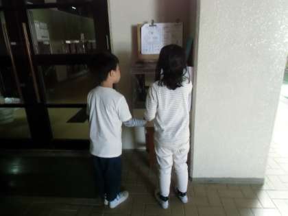 今日はなかよしペアで学校探検をしました。2年生と手をつないでなかよく学校の中を回りました。2年生が作ってくれた各教室の説明カードを読んでくれるのを一生懸命に聞いていました。学校の中の様子がまた少しわかった1年生でした。