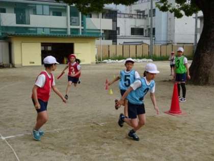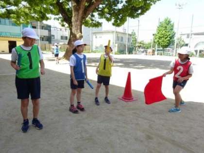リレーの学習では,バトンパスを工夫してタイムを縮めることをめあてに学習しました。