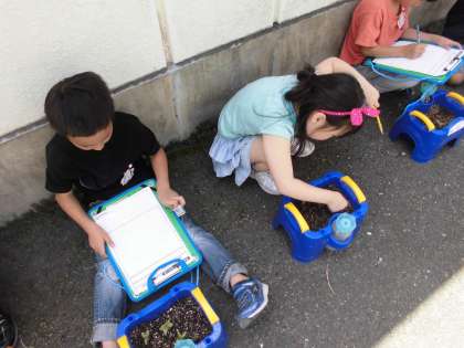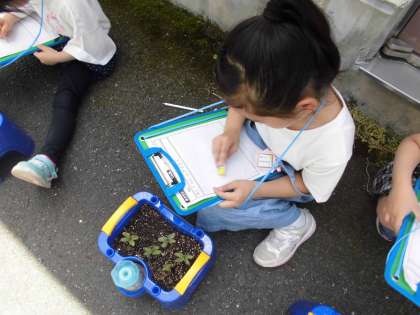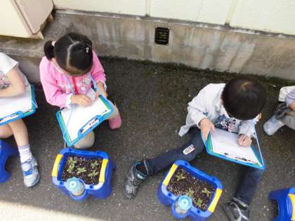 アサガオの芽が出はじめました。種を植えてから1週間です。形・色・手触りなどよく見て観察カードに書きました。早く大きくなってほしいな。