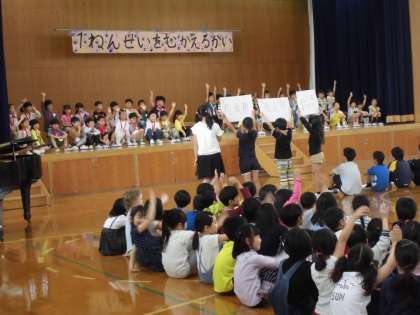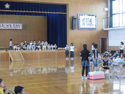 今日は,体育館に全校児童が集まり,「1年生をむかえる会」がありました。