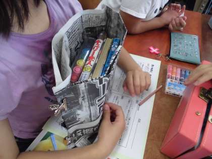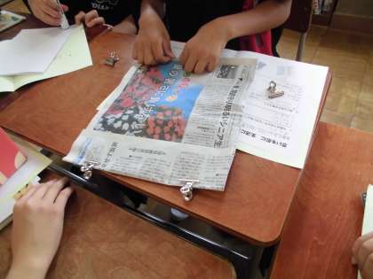 家庭科では「思いを形に 生活に役立つ布製品」の学習をしています。ファイルや筆箱などを入れるカバンを作るには,どれくらいの大きさの布が必要か。新聞紙を使って,「ぬいしろ」や「ゆとり」を計算しながら布の大きさを考えています。