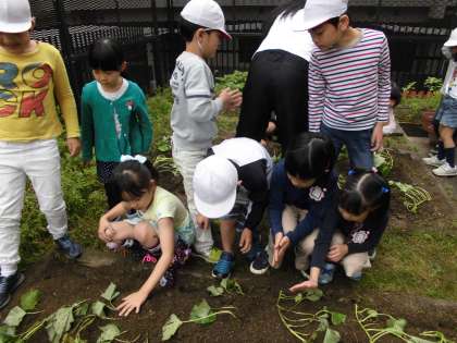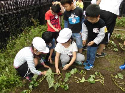 さつまいもを「なかよしぺあ」で植えました。秋にさつまいも収穫パーティーをします。「なかよしぺあ」でこれから大切に育てようね。大きなさつまいもができたらいいな。