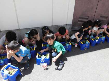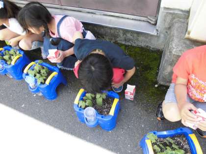 あさがおの間引きをしました。間引いたあさがおは,家に持って帰ったり,お世話になっている高学年の理科・総合の学習で使ってもらうためにプレゼントしました。大切に育ててね。