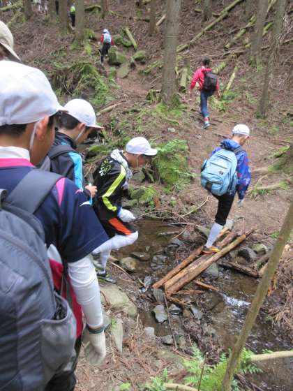 登山開始。しんどいけれど,みんなとなら大丈夫です。途中,丸太の橋を渡ったり,急な坂をのぼったり。