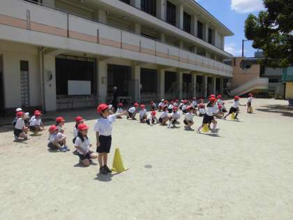 運動場での「リレー遊び」です。置き換えリレーをしました。少し難しいルールでしたがチームの力を合わせて頑張りました。
