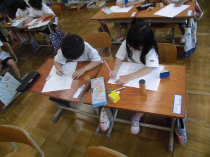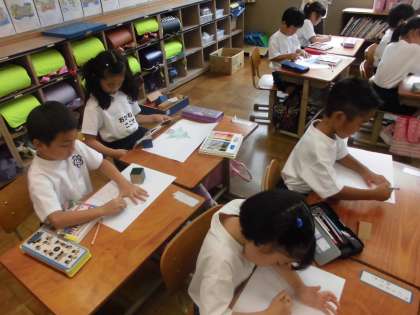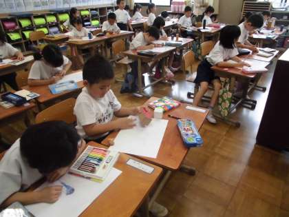 「いろいろなかたち」の学習で,形を写していろいろな絵を描きました。みんな集中して取り組みました。楽しい絵がたくさんかけました。