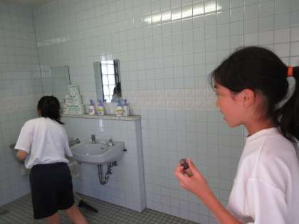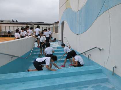 今日は天候の不安がありましたが,それほど雨に降られることもなく,6年生の児童がプールをきれいに掃除しました。1年間でたまったプールの底の泥や壁の汚れなどをきれいに磨いてくれました。また,更衣室やトイレなども隅々までがんばって掃除できました。6年生お疲れ様でした。