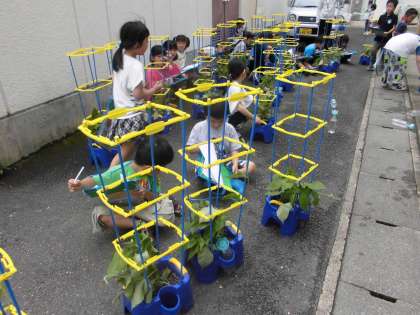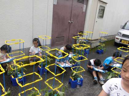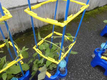 アサガオがどんどん育ってきました。つるが伸び始めているものもありました。「どうしたらいい?」と聞くと,「支柱を立てる!」と子ども達の声。そこで支柱をみんなでたてました。大きくなってね。