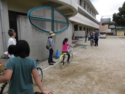 3年生は,自転車の安全点検の方法や正しい乗り方などのお話を聞いた後,実際にコースを走りました。まだまだ自転車の乗り方に慣れていない子も見られ,少しふらついたり,コースを大きくはみ出したりする様子も見られました。