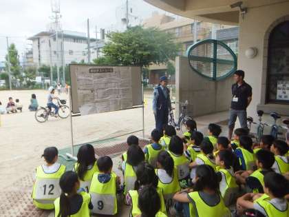 自転車安全教室がありました。まずは,警察の方から自転車の安全な乗り方やコースの説明を受けました。