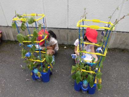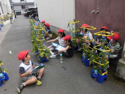 アサガオに大輪の花がさきました。みんなうれしそうに観察しています。よかったね。
