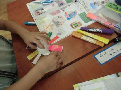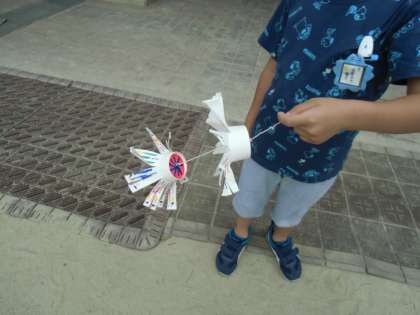 火曜日の図工は,紙コップを使って作りました。はさみを使って羽の数を考えたり色の塗り方を工夫したりといろいろ考えて作りました。運動場で走るとくるくる回りました。
