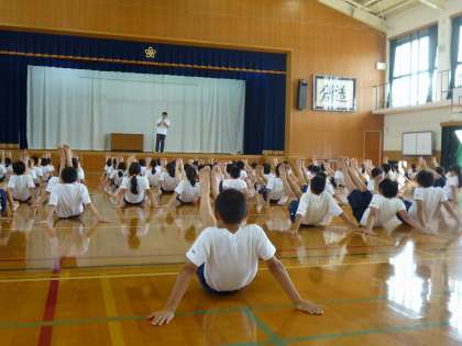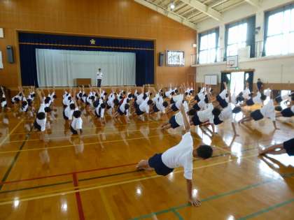 5・6年合同で運動会に向けて,組体操の一人技の練習をしました。指先,つま先まで気をつけながら,より美しくに見えるにはどうしたらいいのか,友達と考えながら取り組みました。