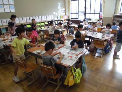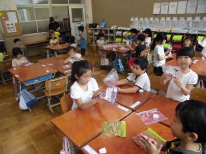 朝顔の花で色みずあそびをしました。夏の間に咲いた花を冷凍保存し,もみながら色水をつくりました。それを折りたたんだ半紙に吸わせて色染めをします。とてもきれいな作品が出来上がりました。