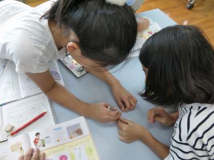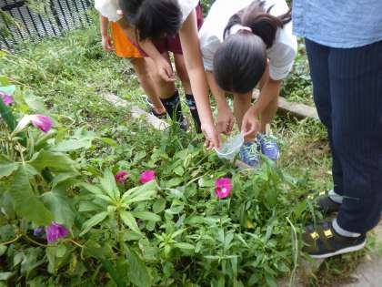 今日の理科の学習では,受粉と実ができることに関係があるのかないのかを調べる実験を行いました。まずは,教室にある切り花(アサガオ)でつぼみのおしべをとる練習をしました。その後,外に出て,実際に植えてあるアサガオのつぼみのわきに切れ目を入れて,おしべをとり,ふくろをかけました。つぼみからおしべをとる作業に苦戦している人がたくさんいましたが,きちんとできたでしょうか。実験結果は明日の理科の時間にわかります。楽しみですね。