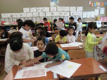 「うみのかくれんぼ」で学習した後,ひとりひとりが自分の好きな生き物を紹介カードに書きました。今日は,1組と2組で交流しました。みんな2回目なのでとても仲良くお互いの生き物を紹介していました。