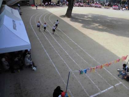 ピストルの合図で走り出す4年生。カーブでもスピードを落とさずに全力で走る姿がかっこよかったです。