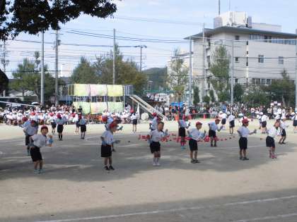 1年生の団体競技「おたから玉入れ」は競技の前後にダンスが入り,会場からは「かわいいね」という声がたくさん聞こえました。