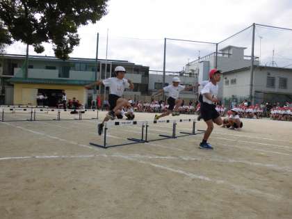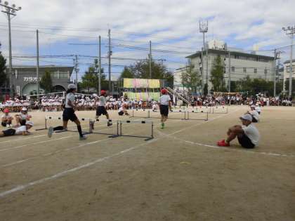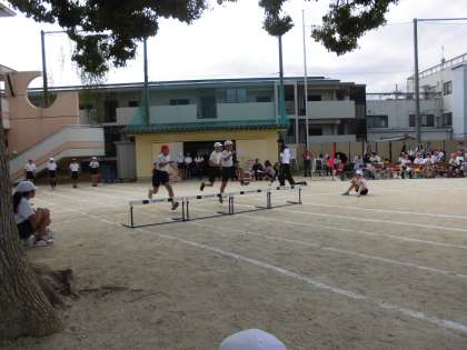 5年生は,昨年の経験を生かし,スピードに乗ったままハードルを跳びこしていきました。途中でハードルに引っかかり転倒する場面もありましたが,最後まであきらめずに懸命に走る姿がよかったです。