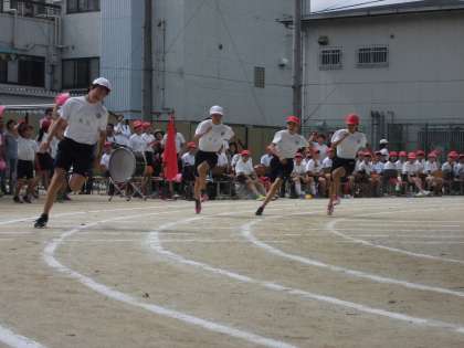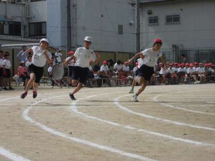 スピードに乗ったままカーブをかけ抜け,最後の直線を力強く走りぬけていく姿に,最高学年である6年生のたくましさを感じました。小学校生活最後の徒競走でしたが,悔いなく走り切れたのではないでしょうか。