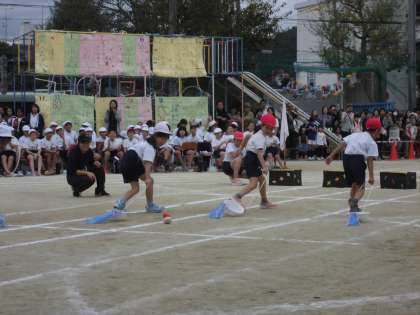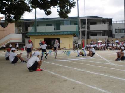 2年生のアイデア走は忍者になりきって,跳んだりくぐったりしました。最後には,箱にボールを投げ入れて,入らなければ進めないというものでした。一回で入る子もいれば二つとも外れてなかなか進めない子もいたりで,順位の入れ替わりが見ていて楽しかったです。