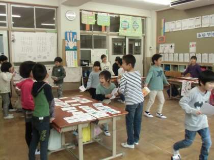 国語の学習の「ものの名まえ」で作った「品物の名前カード」を使ってお店屋さんをしました。初めてだったけど,とても上手にお店の人,お客さんになってできました。「またどうぞ。」「まいど,ありがとうございます。」などお店の人になりきっている人もたくさんいました。次が楽しみです。