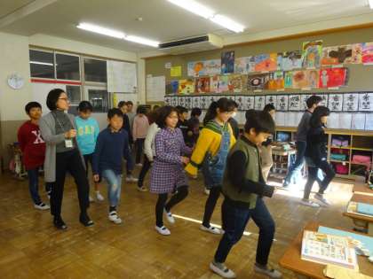 先生のかけ声とともに実際に体を動かして,方向を確認していました。