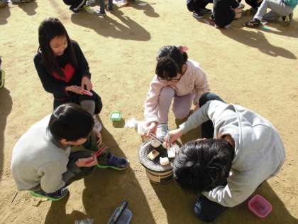 社会科で「昔をつたえるもの」の学習をしています。今日は昔の道具の七輪を使ってお持ちを焼きました。七輪の使い方を教室で学習してから,自分たちで新聞紙や炭をセットしました。初めは様子がわからず少してこずっていましたが,火がつき始めるとうちわで上手に火の調節をしていました。少しこげてしまった人もいましたがみんなおいしくおもちを食べることができました。