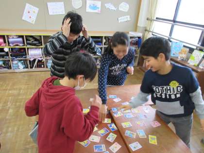 昔遊び係が中間休みにかるた大会を企画してくれました。少ない時間でしたが,「とった!」「おてつき!」と白熱しました。11枚とれた子も!また,やりたいですね。