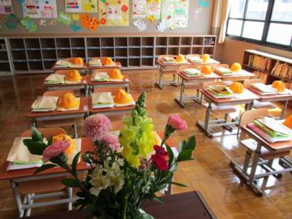 花屋さんが来校され,きれいなお花を生けて下さいました。これで入学式の準備も整いました。明日は,この入口からちょっと緊張して入場してくる新一年生の顔が脳裏に浮かびました。教室でも楽しい学校生活を始める準備ができ,真新しい机がかわいらしいご主人を待っています。
